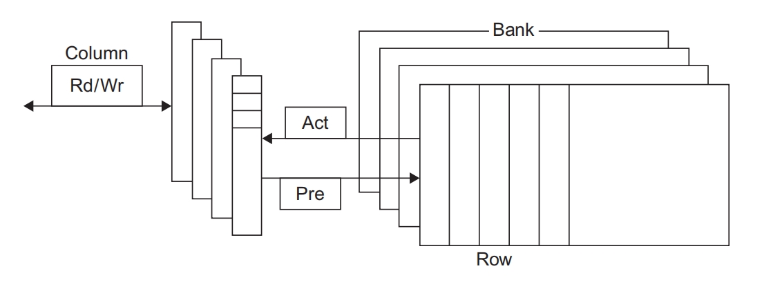 最后,SDRAM引入了体(bank,即存储体),用于帮助功耗管理、缩短访问时间,并允许对不同存储体进行相互交织、重叠的访问。对不同存储体的访问可以相互重叠,每个存储体都有自己的行缓冲区。在一个 DRAM 中创建多个存储体实际上是为该地址又增加了一个段,现在的地址由存储体编号、行地址和列地址组成。在发出一个新存储体的地址时,必须打开这个存储体,从而增加延迟时间。存储体和行缓冲区的管理完全由现代存储器控制接口处理,所以当后续地址指定的是一个已打开存储体中的相同行时,只需发送列地址,从而可以快速进行访问。要发起一次新的访问过程,DRAM 控制器发送一个存储体编号和一个行号(在SDRAM中称为激活—— Activate ,之前称为 RAS ——行选通)。这个命令会打开该行,并将整行数据读人一个缓冲区中。然后会发送一个列地址,SDRAM 可以传送一个或多个数据项,具体取决于是单个请求还是突发请求。在访问新行之前,必须对存储体进行预充电。如果该行位于同一存储体内,则会感觉到预充电导致的延迟;但如果这个新行位于另一个存储体中,那么行的关闭和存储体的预充电可以与新行的访问重叠进行。在 SDRAM 中,这些命令周期中的每一个都需要整数个时钟周期。