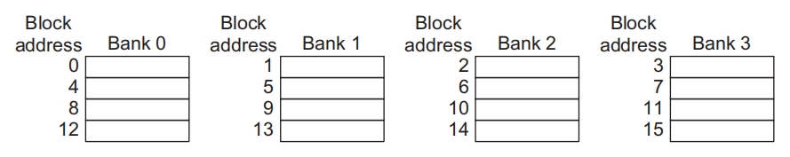 例如,如果有4个存储体0号存储体中的所有缓存块地址都是4的倍数,1号存储体中的所有缓存块地址都是模4余1以此类推。