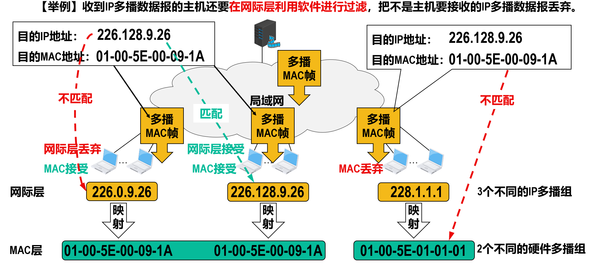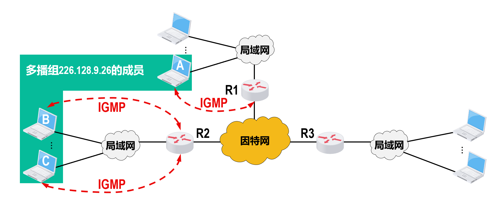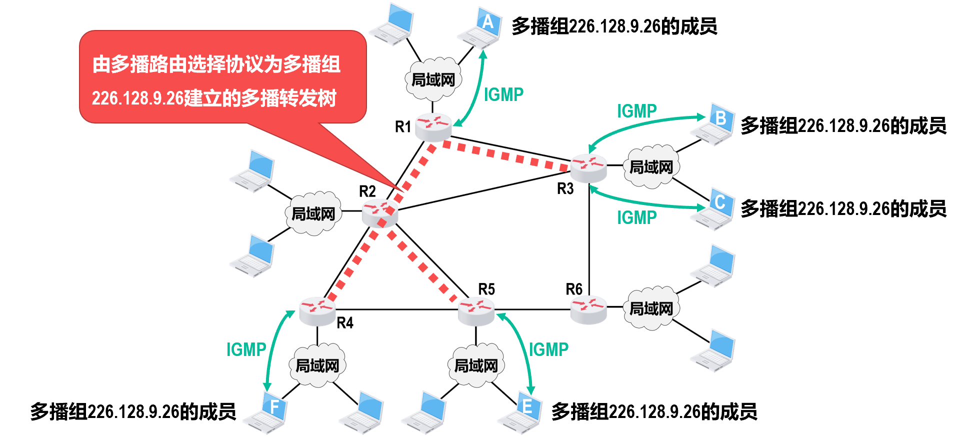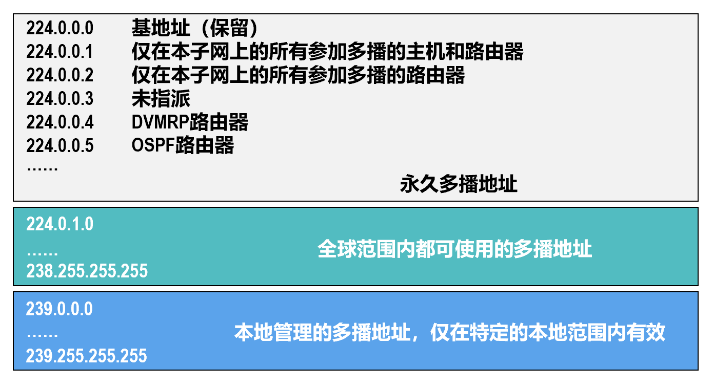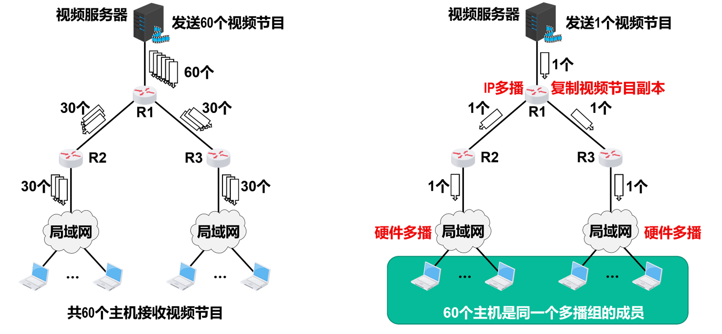 - 多播(multicast): 一点对多点的通信。数据报发送到一组计算机中的每一个。IPv6没有采用广播的术语,而将广播看作多播的一个特例。