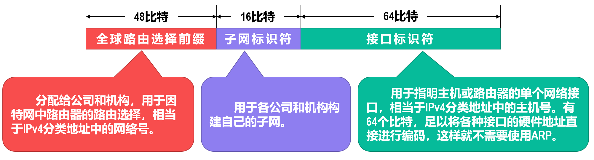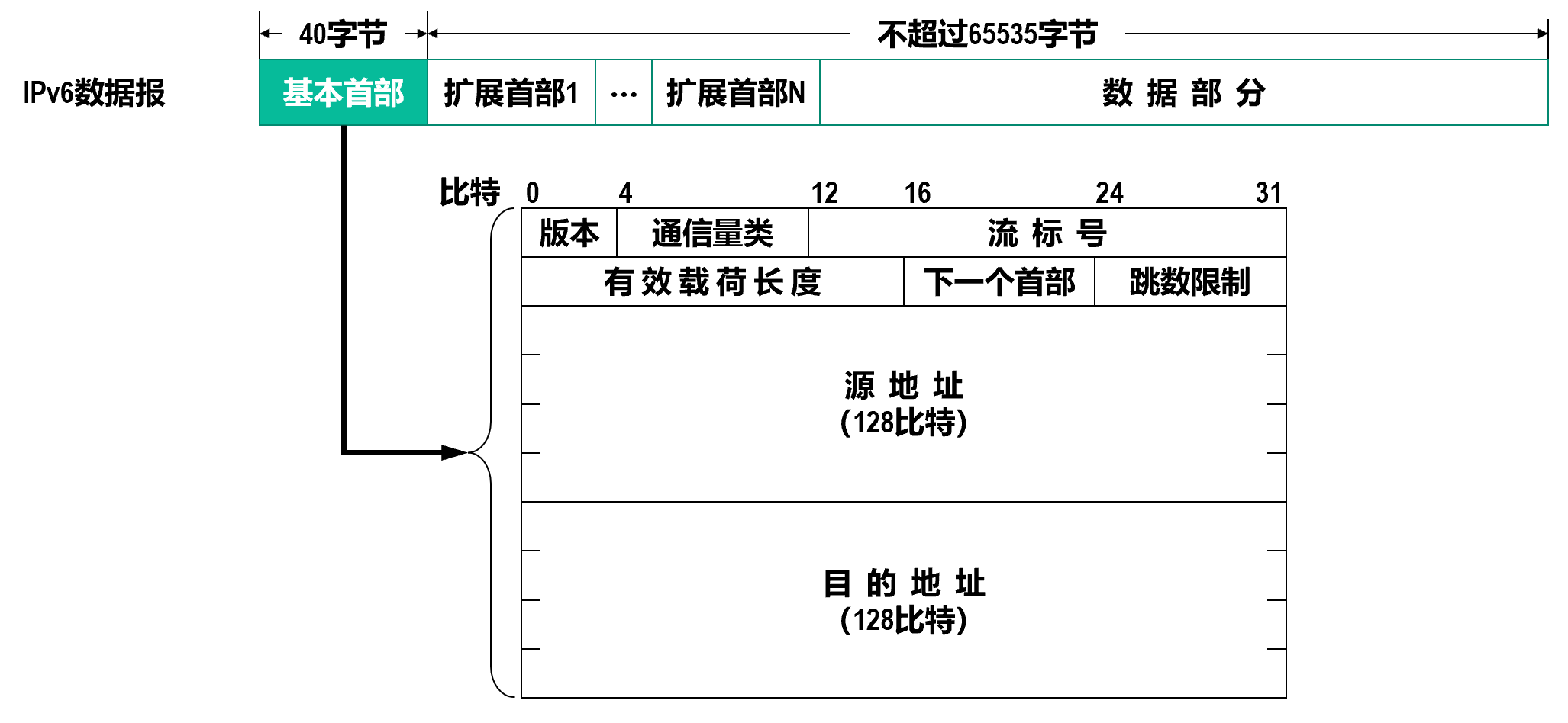 - 源地址字段和目的地址字段:长度都为128比特。分别用来填写IPv6数据报的发送端的IPv6地址和接收端的IPv6地址。