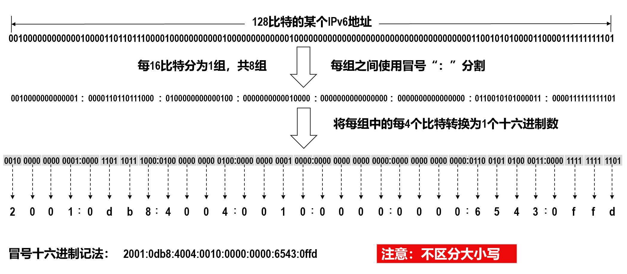 IPv6地址空间的大小为: \(2^{128} > 3.4 \times 10^{38}\) 个地址。