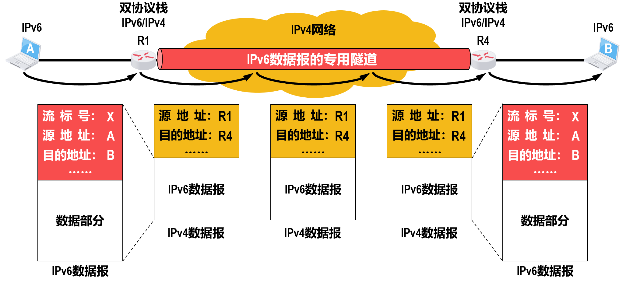 - 封装有IPv6数据报的IPv4数据报在IPv4网络中传输。