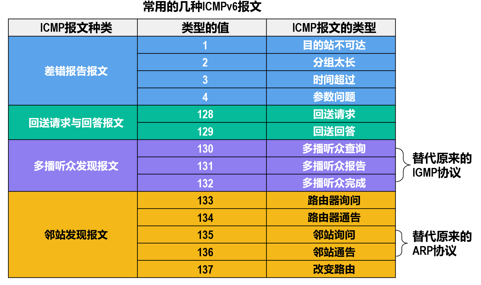 ICMPv6比ICMPv4要复杂得多,它合并了原来的地址解析协议ARP和网际组管理协议IGMP的功能。因此与IPv6配套使用的网际层协议就只有ICMPv6这一个协议。