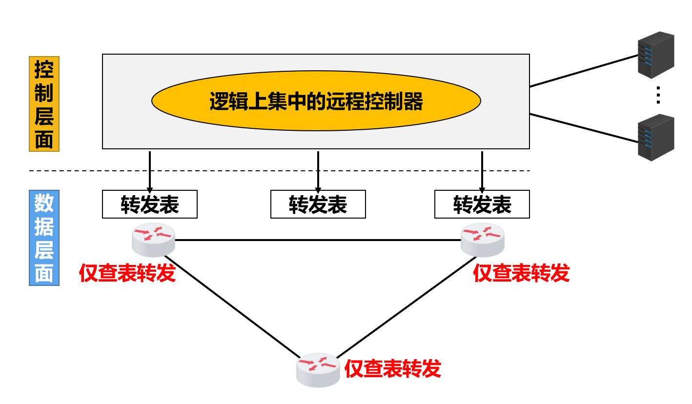 - 逻辑上集中的远程控制器在物理上可由不同地点的多个服务器组成。