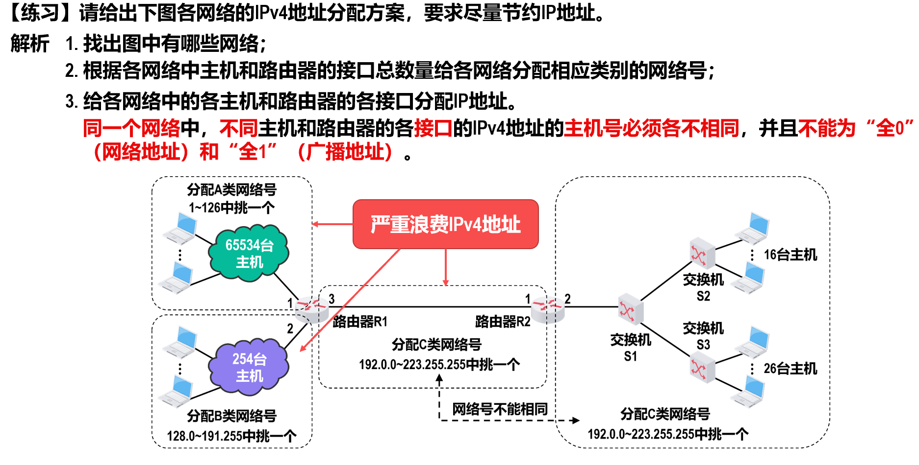 缺点:地址利用率低,容易造成浪费。例如一个单位可能只需要几十个主机,却被分配了一个C类地址(最多支持254主机)。