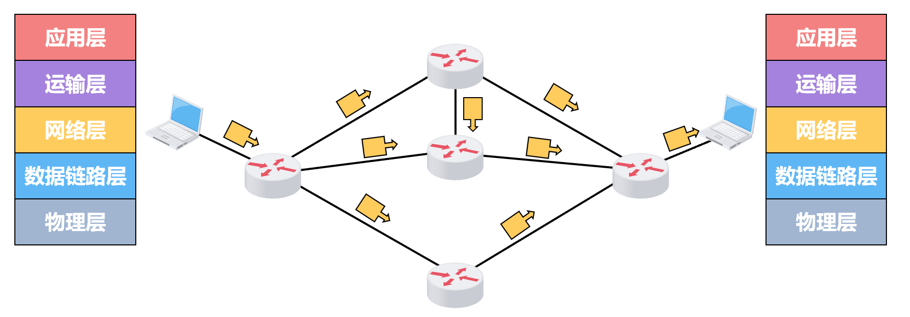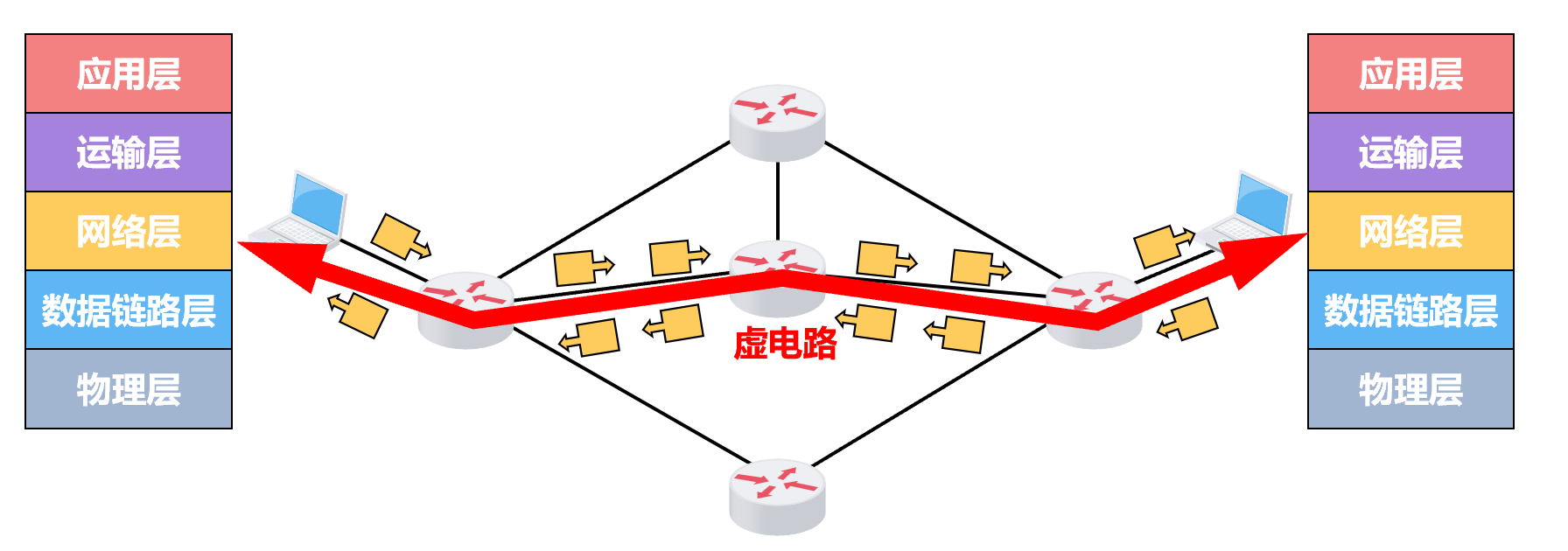 - 虚电路表示这是一条逻辑上的连接,分组沿着这条逻辑连接按照存储转发方式传送,而不是真正建立了一条物理连接。