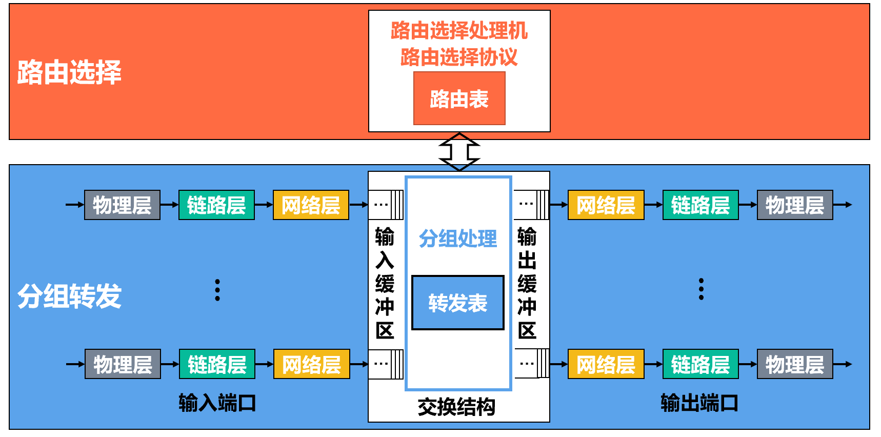 网络层的主要任务就是将分组从源主机经过多个网络和多段链路传输到目的主机,可以将该任务划分为分组转发和路由选择两种重要的功能。