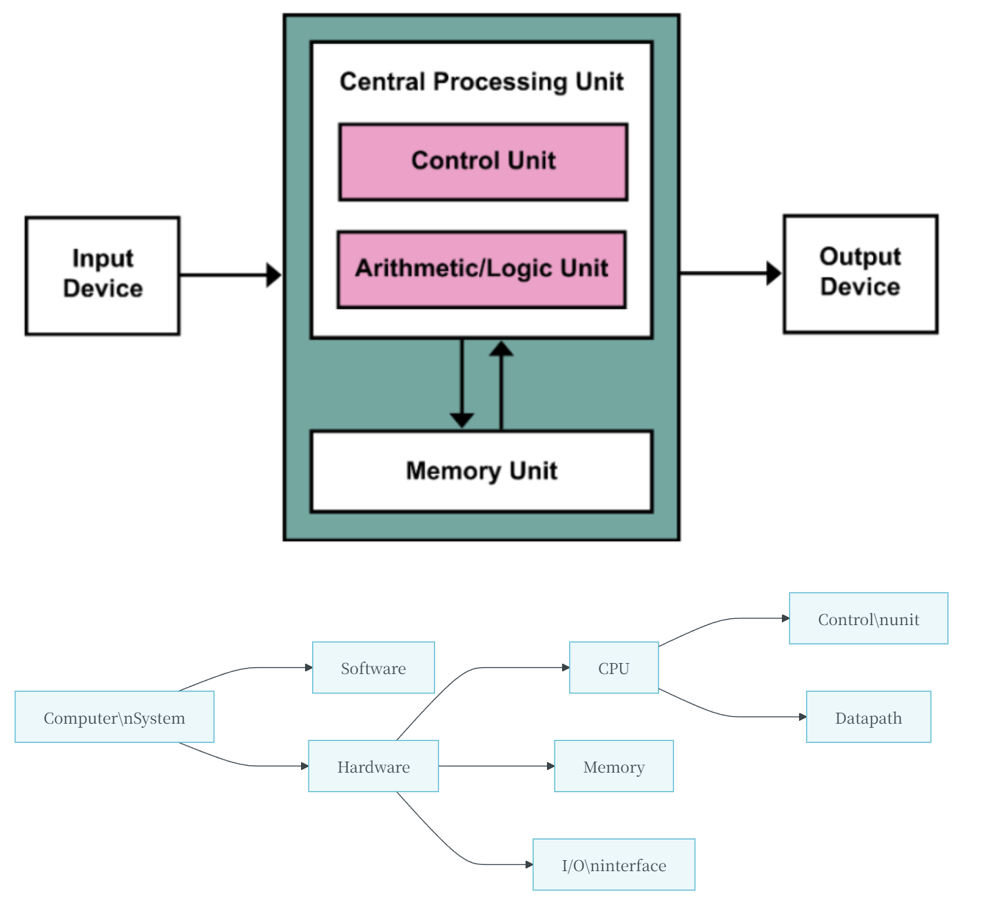 - Disk / Tape -> Main Memory(DRAM) -> L2-Cache(SRAM) -> L1-Cache(On-Chip) -> Registers