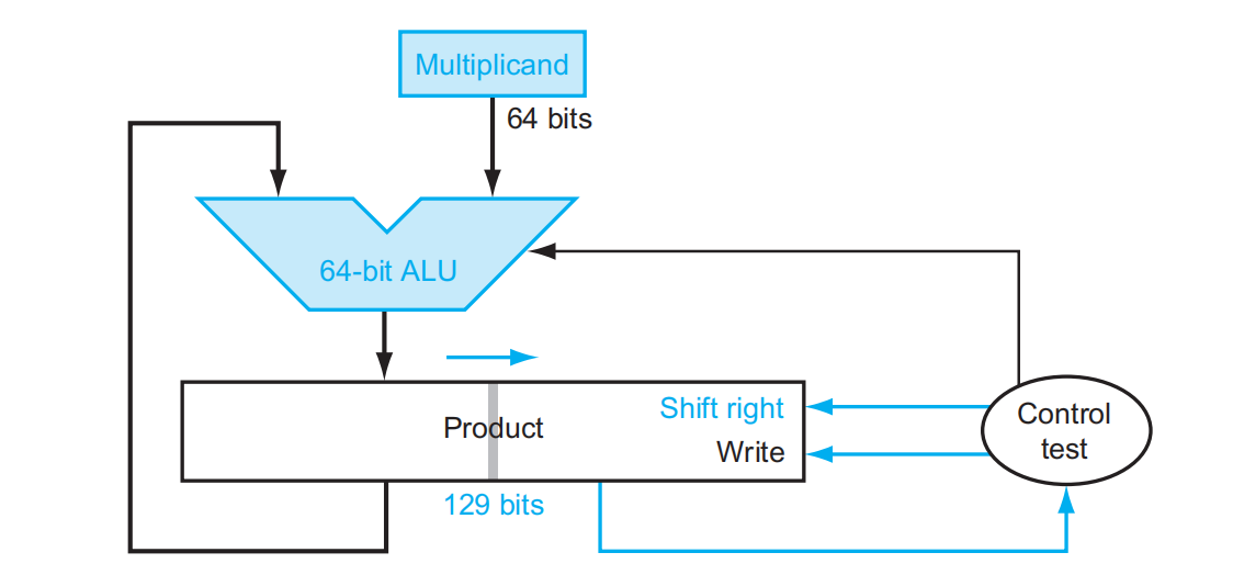 - 如果是,则将 Multiplicand 寄存器的值加到 Product 寄存器的左半部分里;
