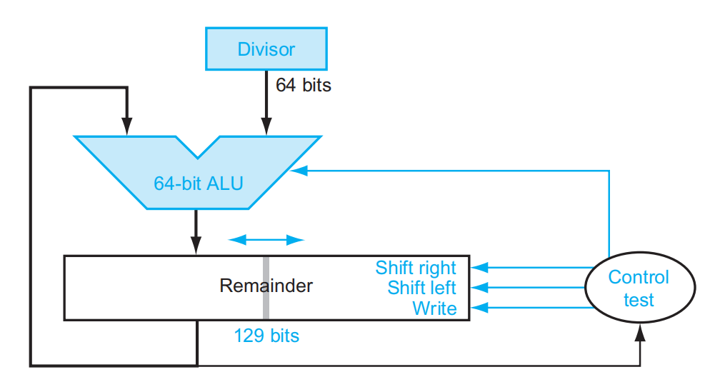 - 将 Divisor 寄存器中的数从 Remainder 寄存器的左边减掉,并把结果放在左半边;