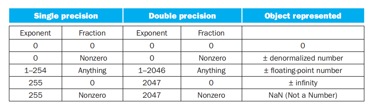 - 第 2 条表示非规格化数,这种数主要是为了用来表示一些很小的数,它的取值为 \((−1)^S \times (0+fraction) \times 2^{−bias}\);但是并非所有机器都支持这种表示,有的机器会直接抛出一个 exception。我们不考虑非规格数的存在;