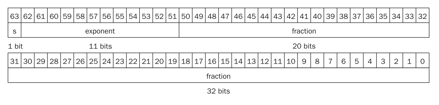 - 双精度浮点数:\(±1 \times 2^{−1022}∼±(2−2^{−52}) \times 2^{1023}\)