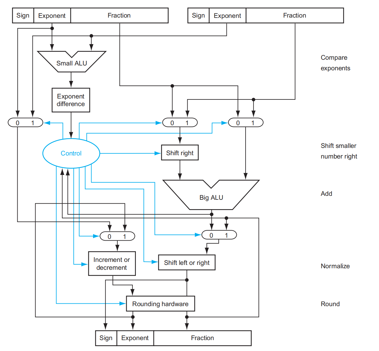 Rounding: 将 Fraction 部分舍入到正确位数;舍入结果可能还需要规格化,此时回到步骤 3 继续运行