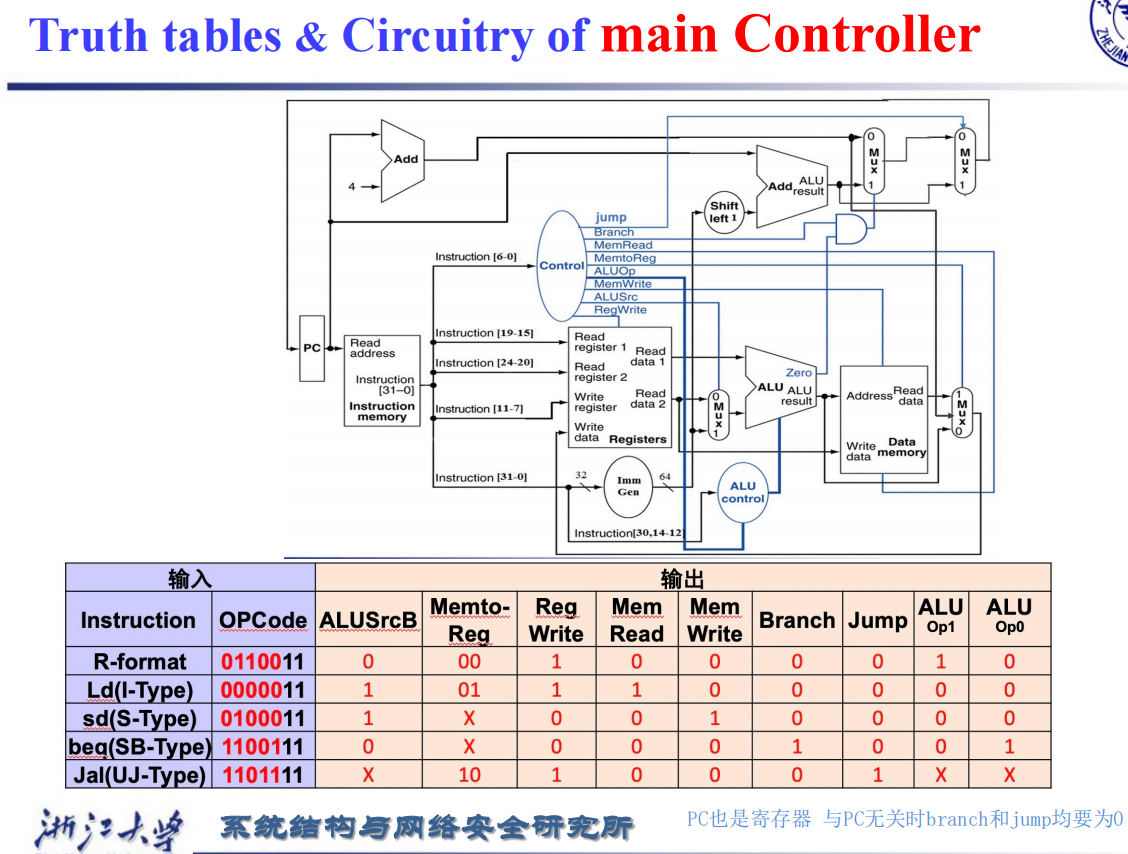 。 - ALU将从寄存器堆读出的两数相减。PC与左移一位、符号扩展的指令中的12位(偏移)相加,结果是分支目标地址。