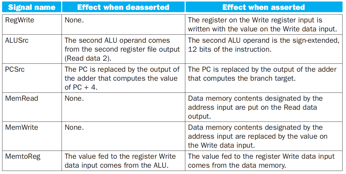 6个控制信号的功能。当两路多选器的1位控制信号有效时,多选器选择对应于1的输入。否则选择对应于0的输入。请记住,所有状态单元都将时钟信号作为隐式输入,而且时钟控制写操作。时钟信号从来不在状态单元之外通过任何门电路,因为这样可能导致时序问题。