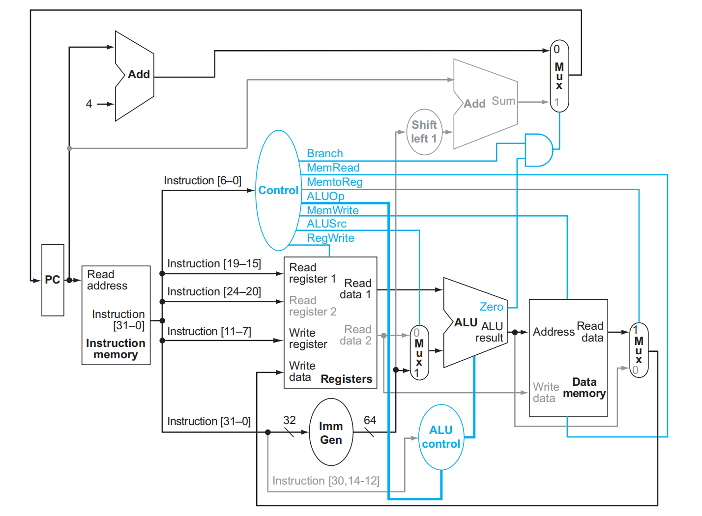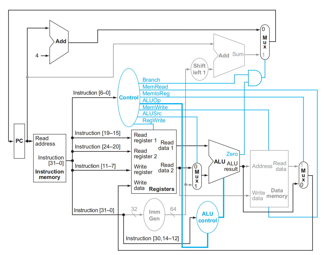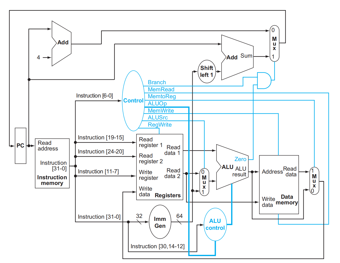 - ALU将PC与左移一位、符号扩展的指令中的12位(偏移)相加,结果是跳转目标地址。再更新PC。