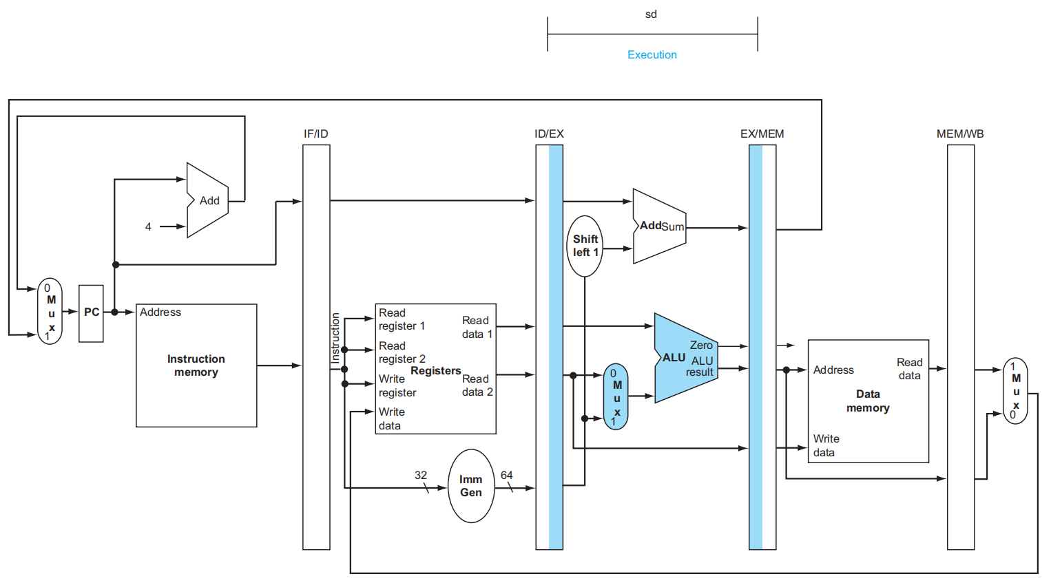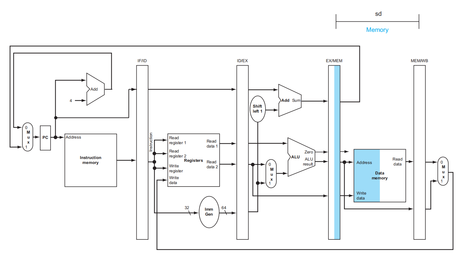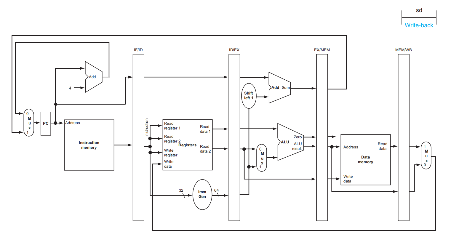 sd(S-type) | 立即数 | X | 不写回寄存器 | 不读内存 | 写内存 | 不分支 | 00 |