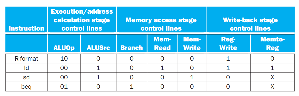 ld(I-type) | 立即数 | 内存读出结果 | 写回寄存器 | 读内存 | 不写内存 | 不分支 | 00 |