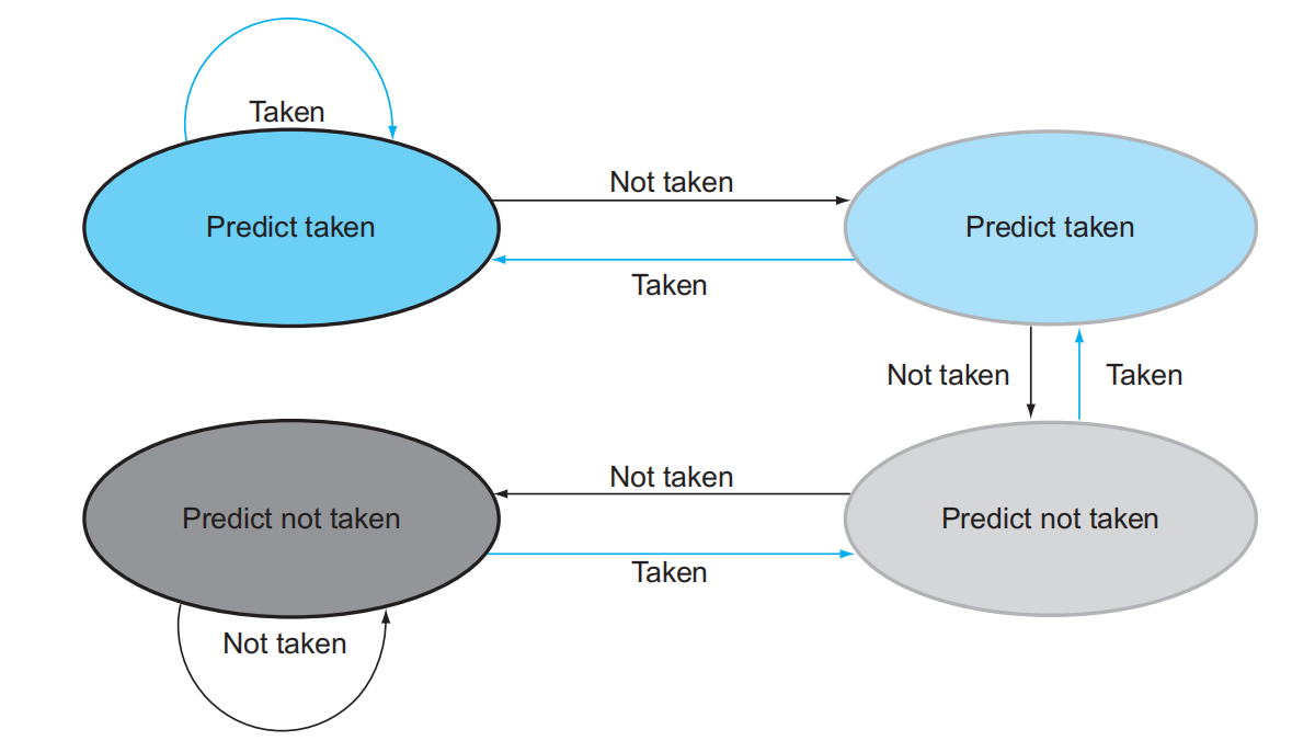 NOTE : 2位预测机制的状态转换图。通过使用2位而不是1位的预测位,在一个分支经常发生跳转或经常不跳转的情况下(大多数分支都是这样的)只会发生一次预测失效。2位预测位在系统中可以被编码为四个状态。2位预测机制是基于计数器的预测器的一个实例,该预测器在分支跳转时加1,在分支不跳转时减1,并且使用表示范围的中位数作为预测分支跳转与不跳转之间的分界点。