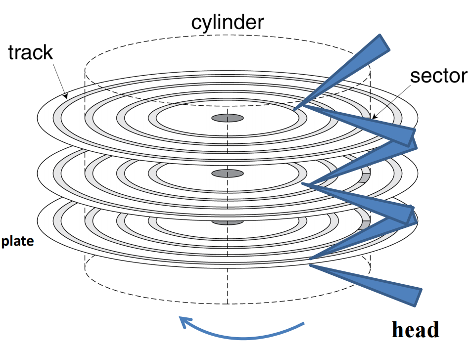- 柱面(cylinder):表示某磁头在给定点能够访问到的所有磁道集合。