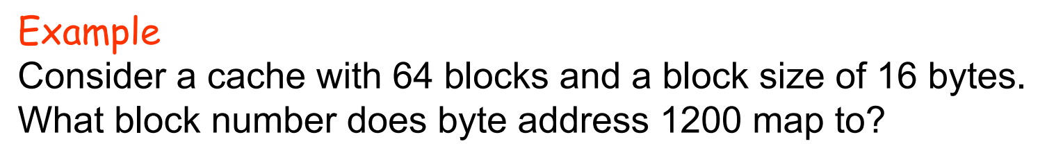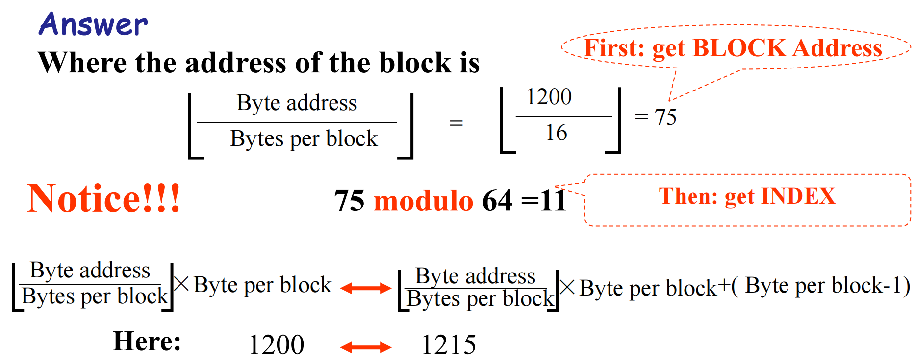 每块中的字节数为16,则字节地址1200对应的块地址为 \(\frac{1200}{16} = 75\) , 该块地址映射到的 cache