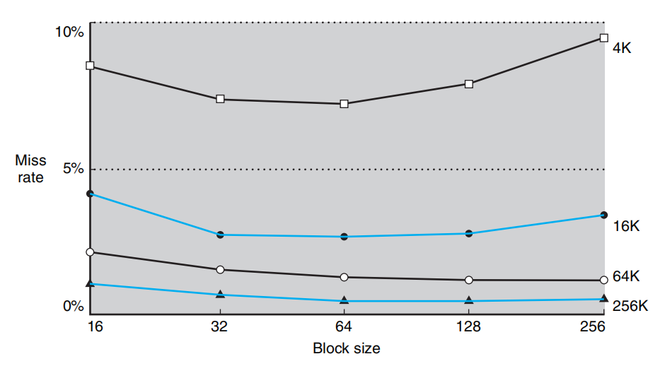 下图中,随着块大小的增长,失效率通常都在下降。如果单个块大小占 cache