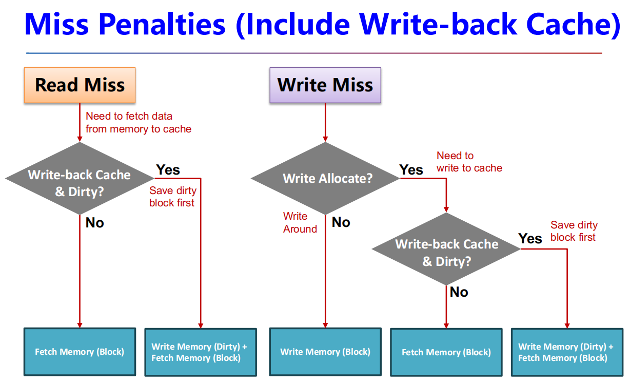 - If the cache block size is one word, the write miss penalty is 0. (Except the block is dirty)