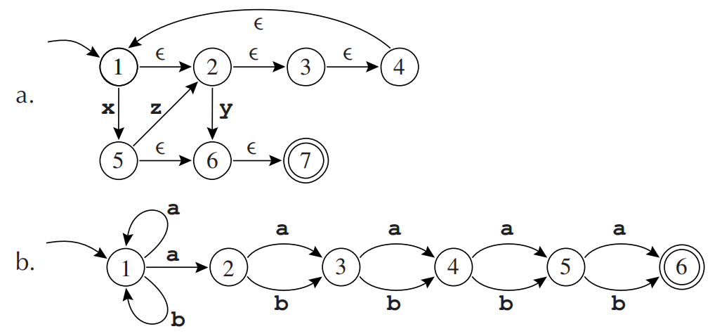 c. Regarding the problem of matching brackets in C, the finite state machine corresponding to the regular expression, as mentioned in the two questions above, cannot remember how many brackets there are, and these brackets can be nested infinitely.
