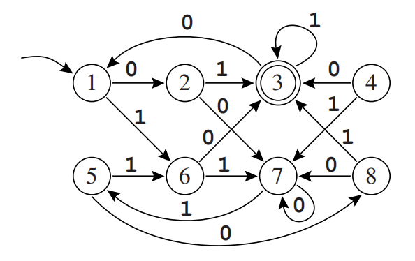Find two equivalent states in the following automaton, and merge them to produce a smaller automaton that recognizes the same language. Repeat until there are no longer equivalent states.