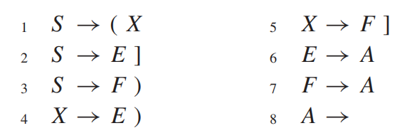 \(S \rightarrow E ]\):由于 \(E \rightarrow \epsilon\),所以 \(FIRST(E ]) = \{ ] \}\)