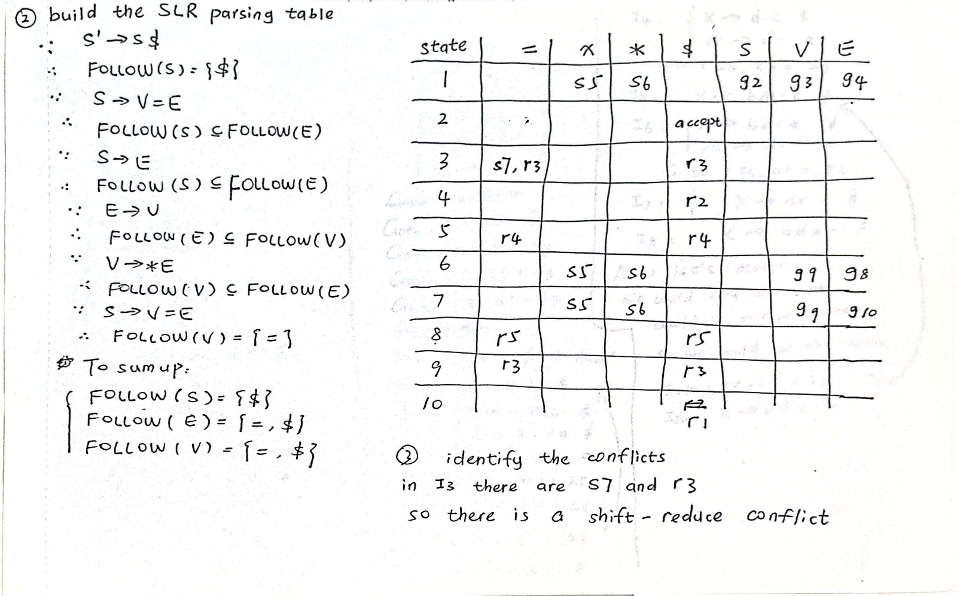 从上面构建的 SLR 分析表中我们可以清晰地看到,状态 2 (State 2) 在遇到终结符 = 时存在移进-规约冲突 (Shift/Reduce Conflict)。
