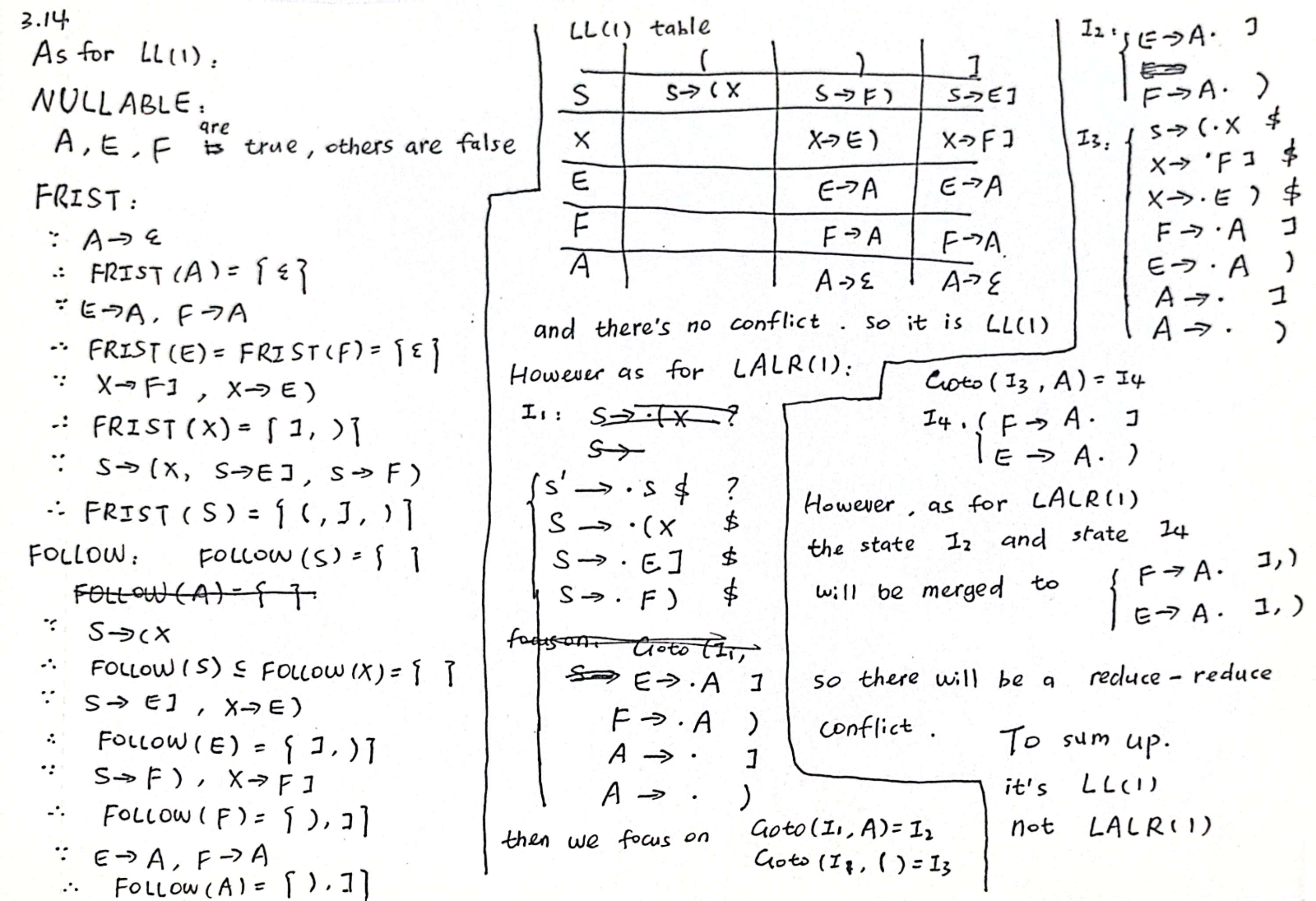 由于点在 \(F\) 前面,求 \(F \rightarrow \cdot A\) 的 Lookahead:\(FIRST() \$) = \{ ) \}\)。
