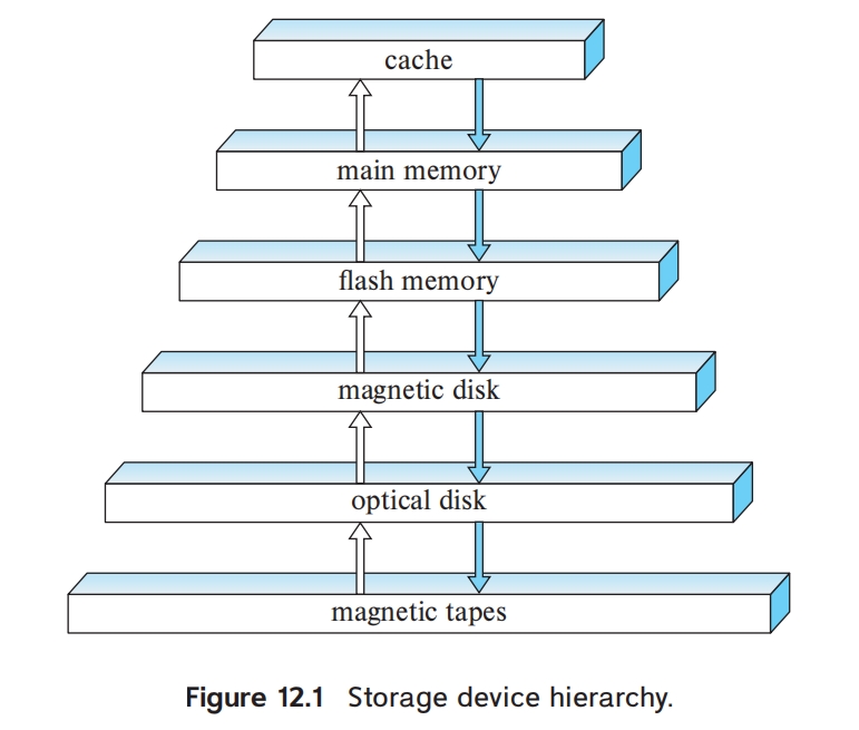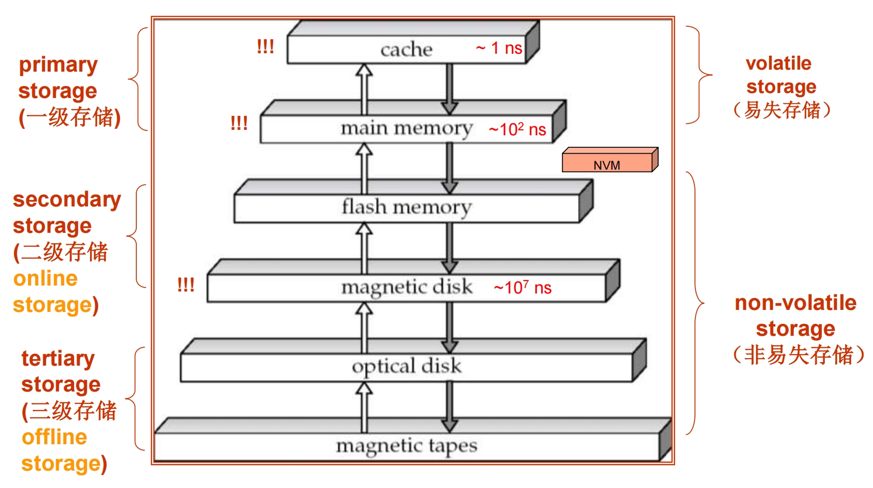最快的存储介质(例如高速缓存和主存)称为主存储器(primary storage)。层次结构中主存储介质的下一层介质(例如闪存和磁盘)称为辅助存储器(secondary storage),或在线存储器(online storage)。层次结构中最底层的介质(如磁带和光盘)称为三级存储器(tertiary storage),或离线存储器(offine storage)。