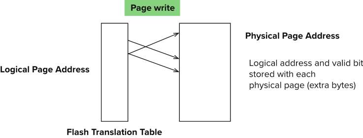 闪存系统通过将逻辑页号映射到物理页号来限制慢的擦除速度和更新限制的影响。当一个逻辑页被更新时,它可以被重新映射到已被擦除的任何物理页,并且它原来的位置可以随后被擦除。每个物理页都有一个小的存储区域来保存它的逻辑地址;如果逻辑地址被重新映射到一个不同的物理页,则原来的物理页被标记为已删除。因此,通过扫描物理页,我们可以发现每个逻辑页的位置。为了快速访问,逻辑到物理的页面映射被复制到内存中的转换表(translation table)中。