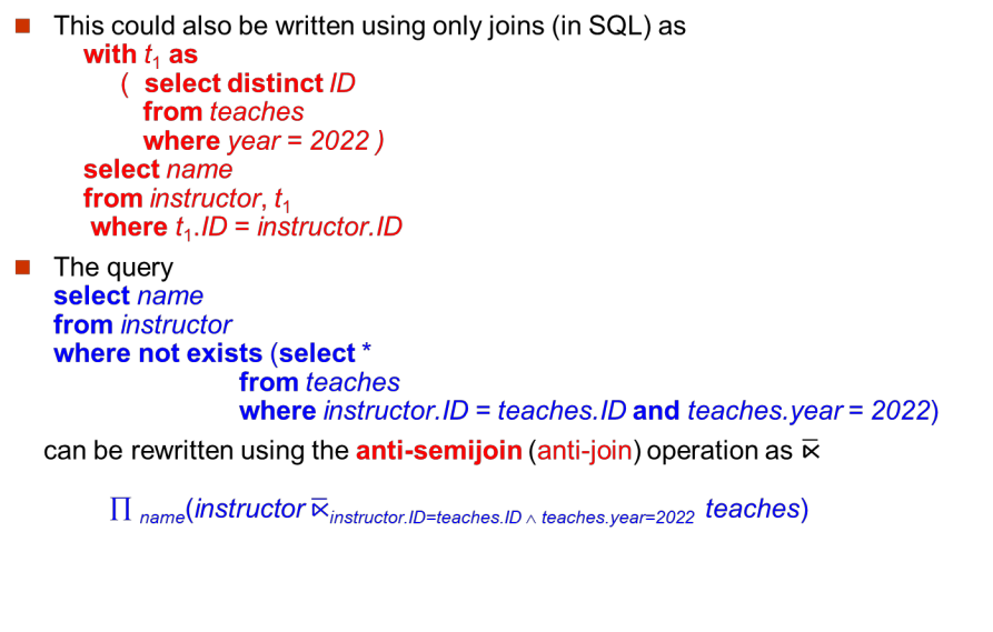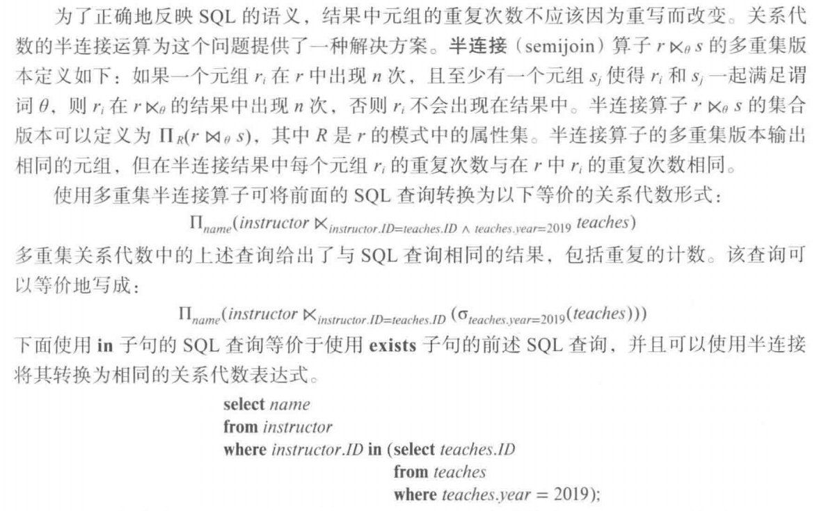 The process of replacing a nested query by a query with a join/semijoin (possibly with a temporary relation) is called decorrelation (去除相关)
