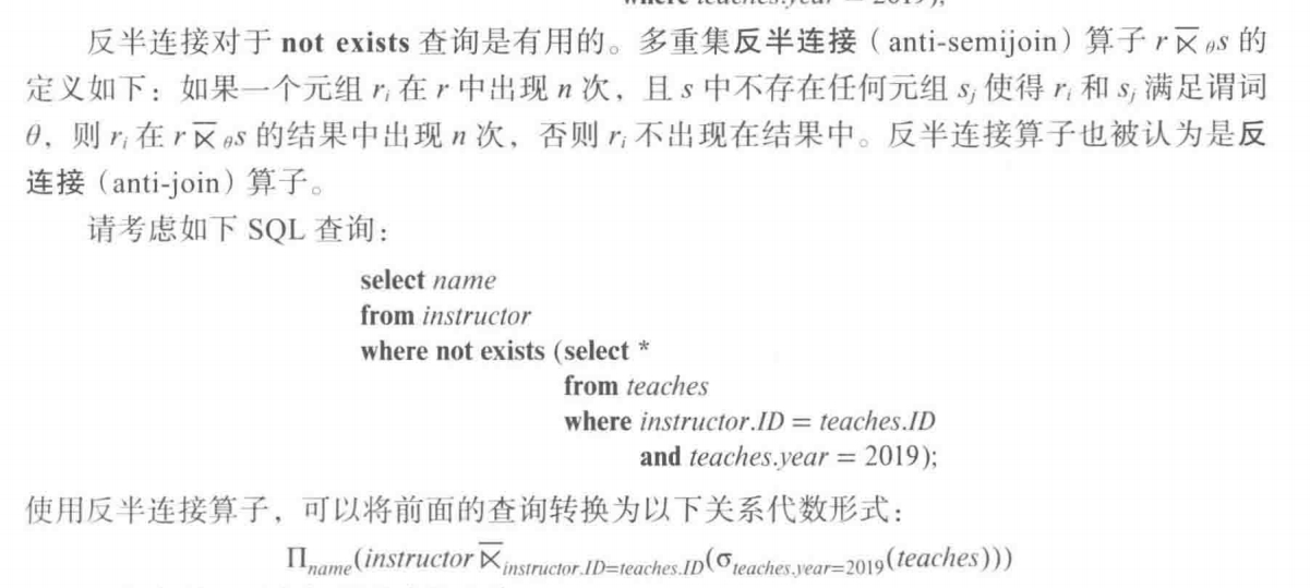 通过将嵌套子查询作为函数来调用的方式执行嵌套子查询的技术称为相关执行(correlated evaluation)。相关执行的效率不是很高,因为子查询对于外层查询中的每一个元组都进行单独的运算。这可能导致大量的随机磁盘 I/O 操作。