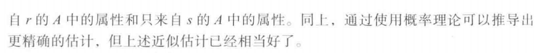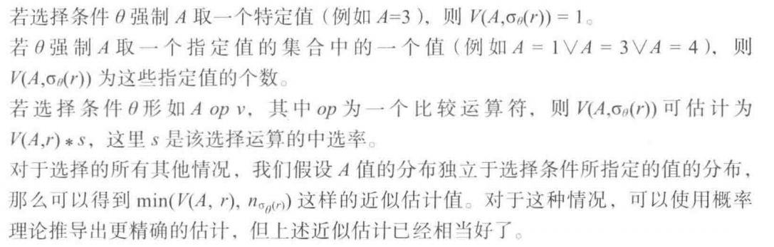 - 否则,如果没有可用的直方图,我们假设取值是均匀分布的(即每个值以同样的概率出现),并假设 r 的一些记录在属性 A 上的取值为 a ,则选择结果估计有 \(n_r / V(A, r)\) 个元组。