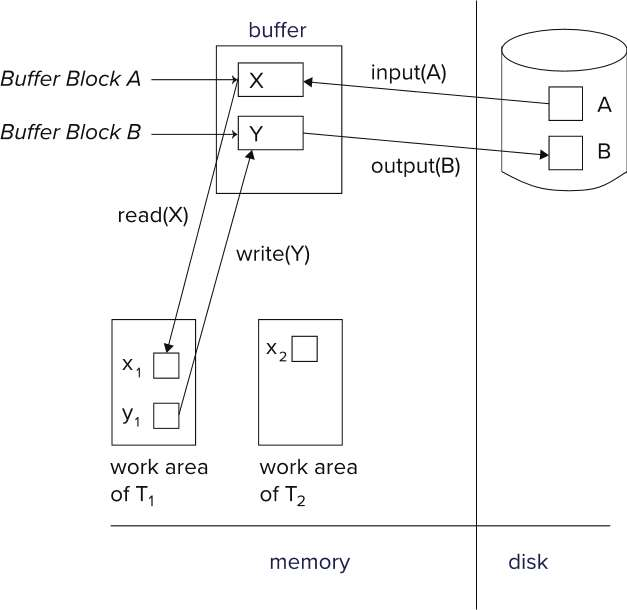 - write(X), which transfers the value in the variable X in the main memory work area of the transaction that executed the write operation to the datat item X in database.