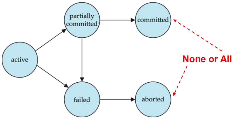 - Aborted – after the transaction has been rolled back and the database restored to its state prior to the start of the transaction.