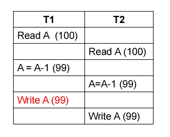 Isolation requirement — if between steps 3 and 6, another transaction T2 is allowed to access the partially updated database, it will see an inconsistent database (the sum A + B will be less than it should be).