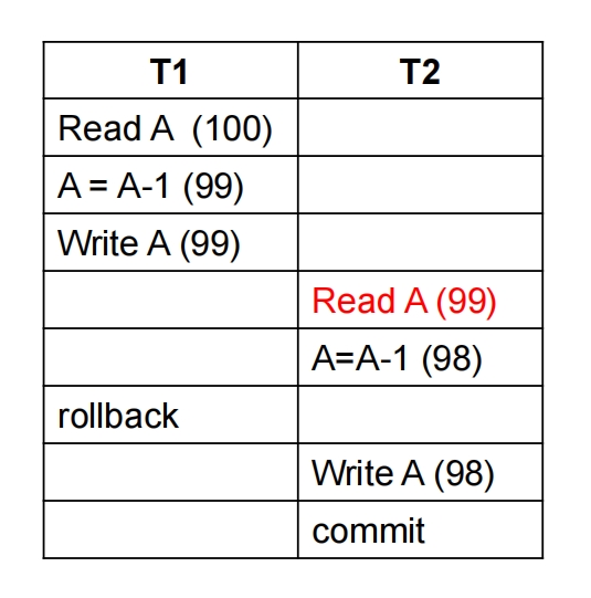 - T2 看到 A=50, B=200 → A + B = 250 ≠ 初始值 300(不一致状态)。