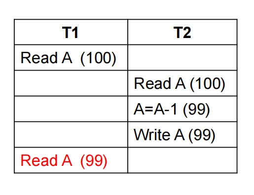 - 若另一个事务 T2 在此时读取 A 和 B: