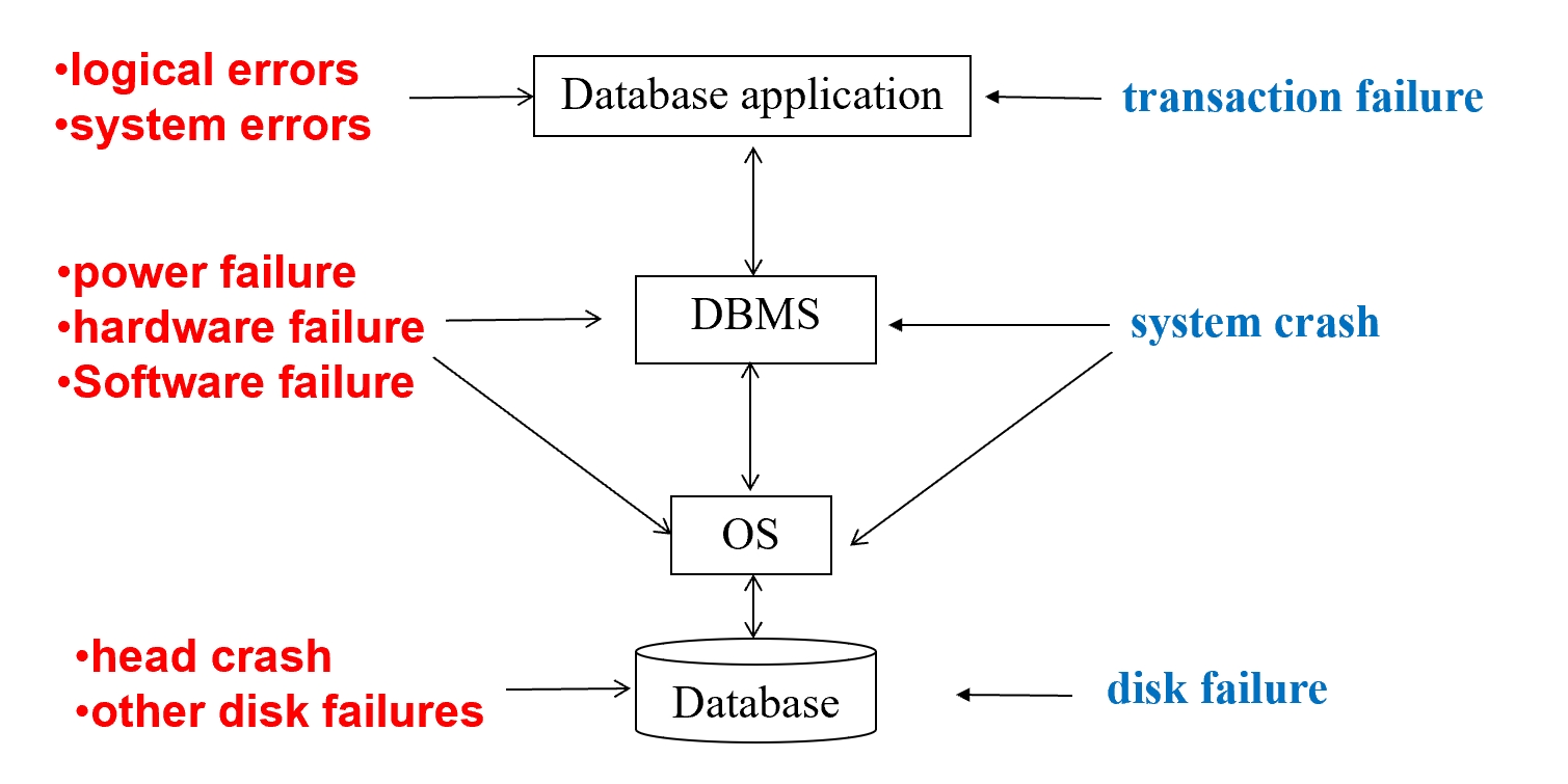 - Logical errors: transaction cannot complete due to some internal error condition 指应用程序代码本身的缺陷,比如算法错误、业务逻辑处理不当等,导致对数据库的错误操作请求。