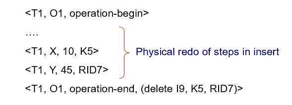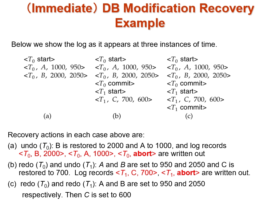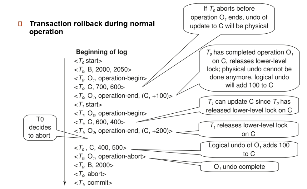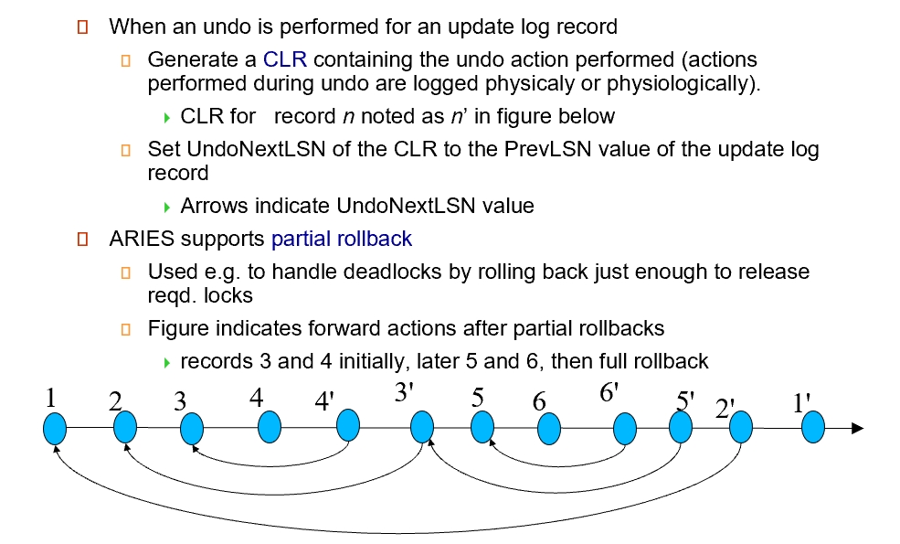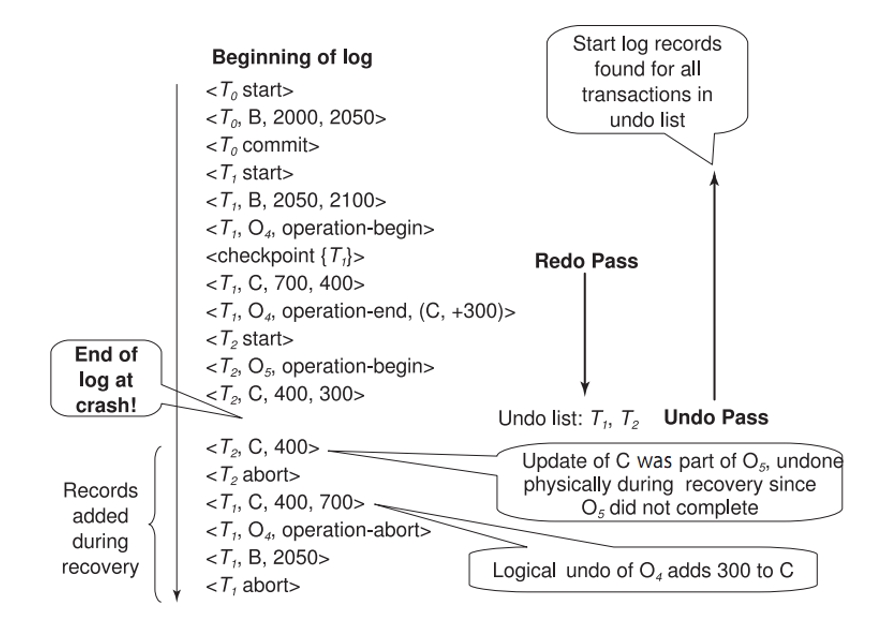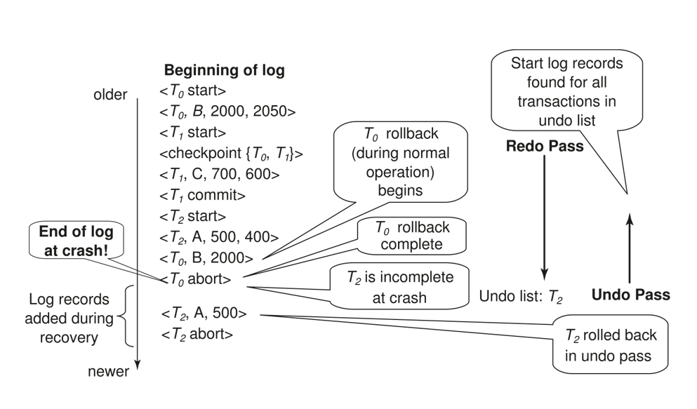 Note that If transaction \(T_i\) was undone earlier and the <\(T_i\) abort> record written to the log, and then a failure occurs, on recovery from failure \(T_i\) is redone