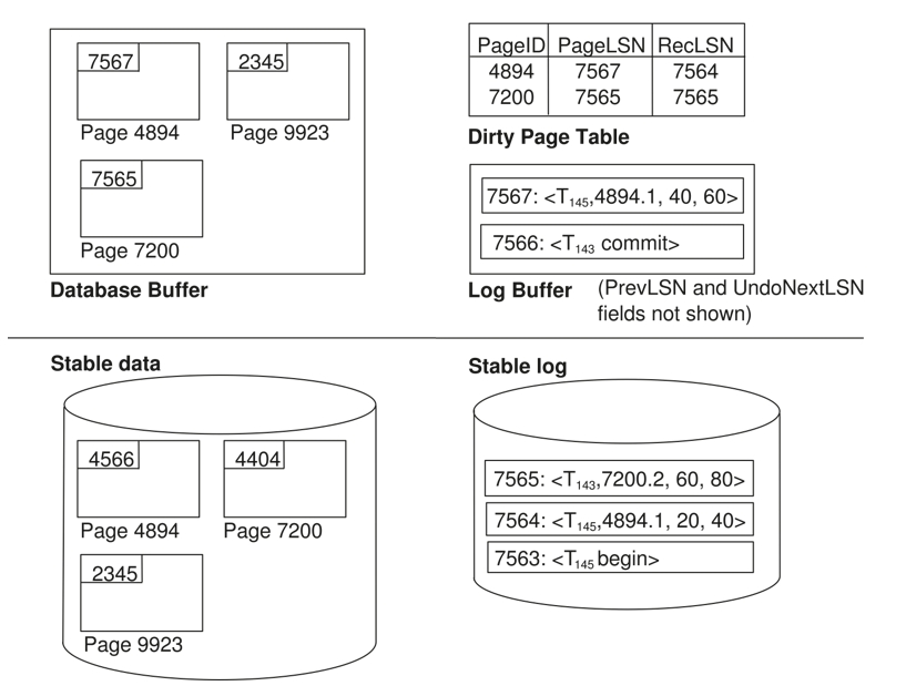 - 活动事务表 (Txn table / ATT): 此时只有事务 \(T_{145}\) 是活动的,其最后一条日志记录的 LSN (lastLSN) 是 7567。