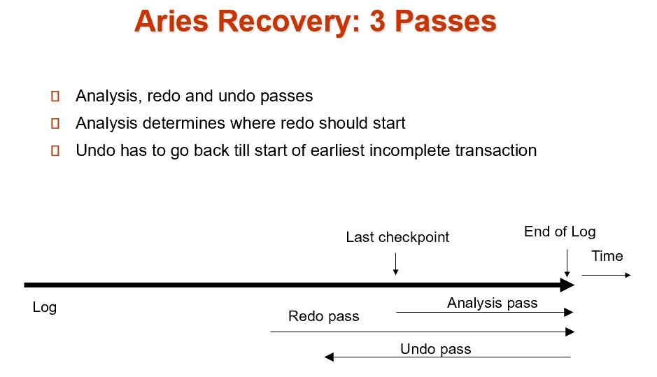 这张图非常清晰地展示了 ARIES 恢复算法在发生崩溃后的三个核心阶段:分析 (Analysis)、重做 (Redo) 和撤销 (Undo)。日志记录从下往上表示时间上从旧到新。
