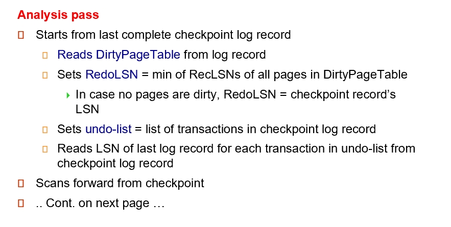 - Continue scanning backwards till a record <\(T_i\) start> is found for every transaction \(T_i\) in L.