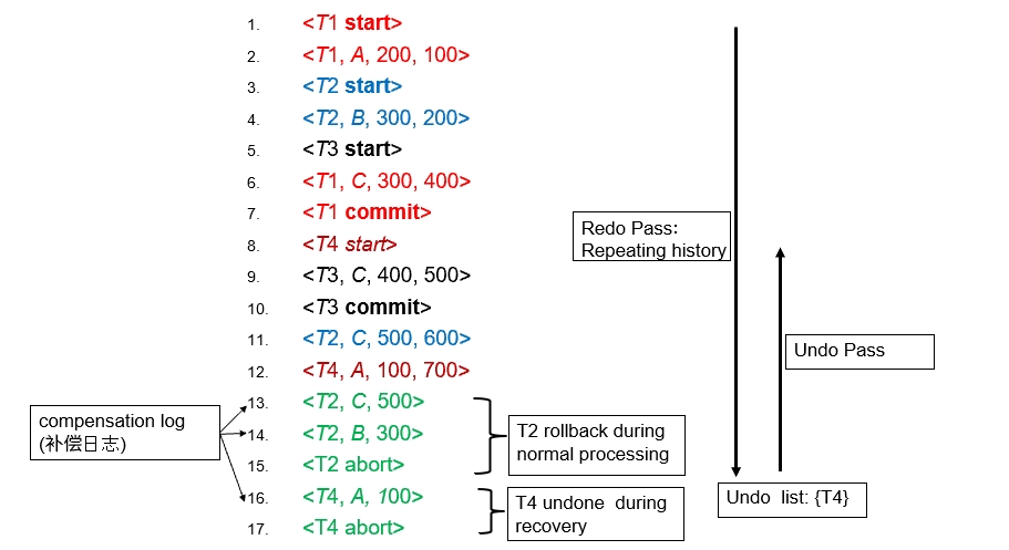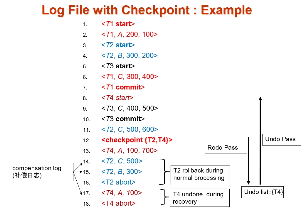 - each time a data item X is restored to its old value V a special log record <\(T_i\) , X, V> is written out – compensation log(补偿日志)