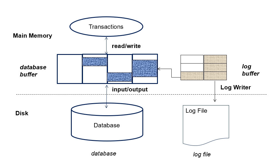 With concurrent transactions, all transactions share a single disk buffer and a single log file.