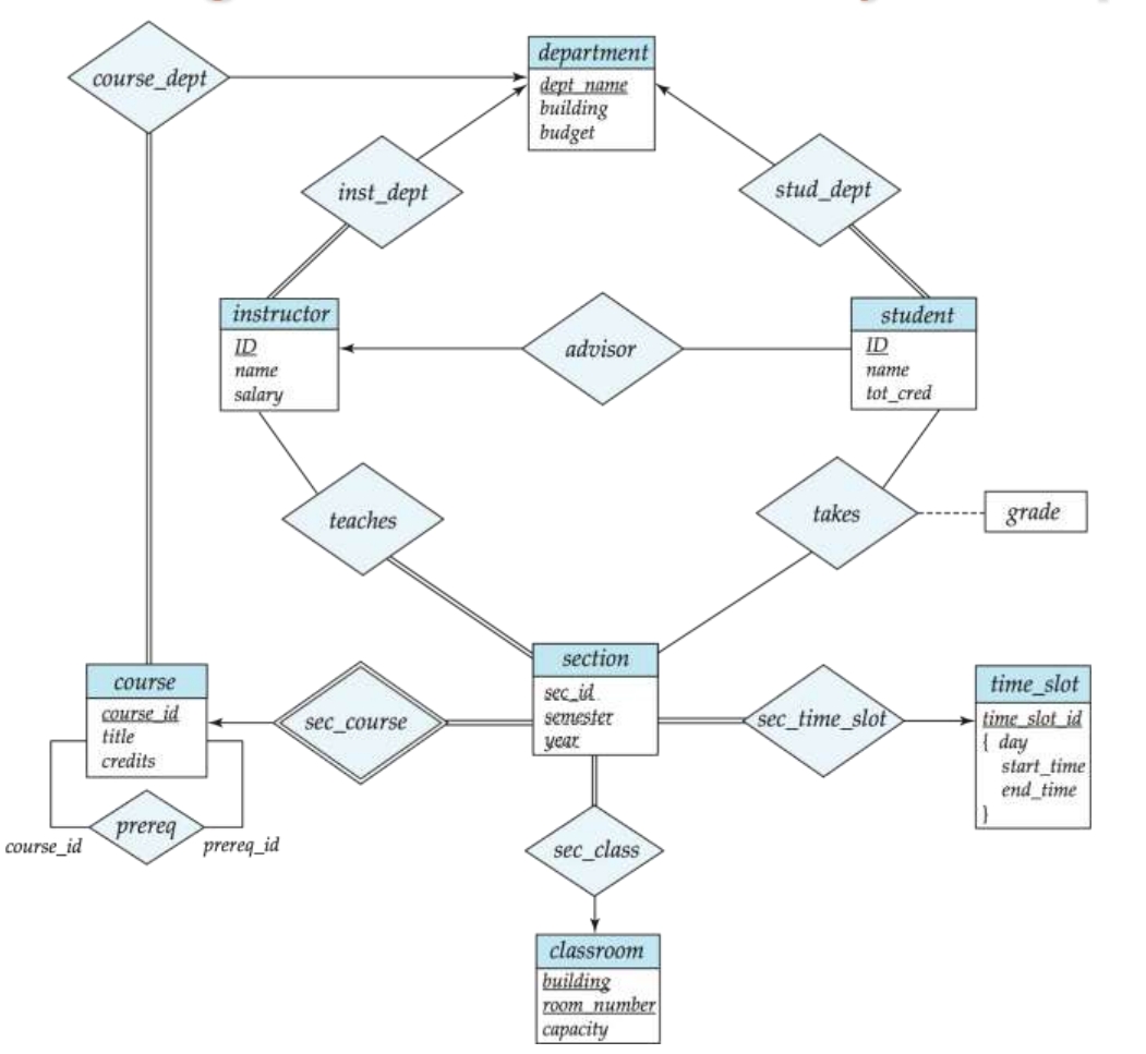 该图还说明使用双线来表示的(弱)实体集 section 在 sec_course 联系中的参与是全部的,这意味着每个课程段必须通过 sec_course 与某门课程相关联。最后,从 sec_course 指向 course 的箭头表示每个课程段与单门课程相关联。通常,弱实体集必须全部参与其标识性联系集,并且该联系是到标识性实体集的多对一联系。